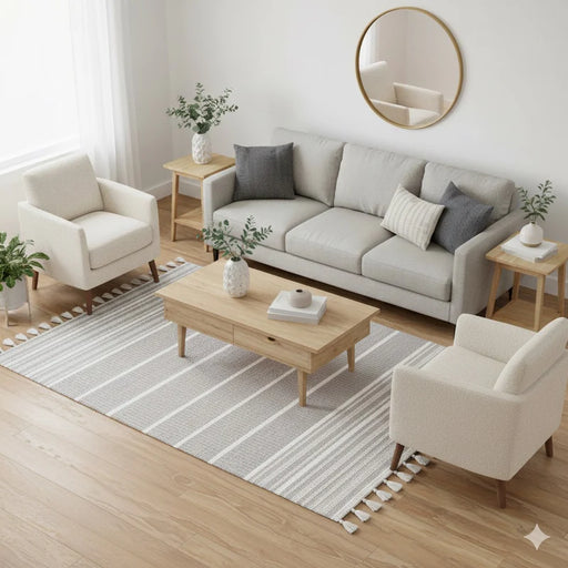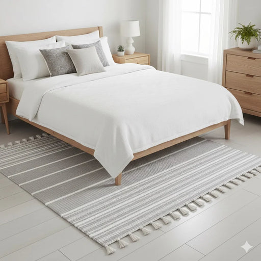 Size 5' x 7' Color White/Gray Hand Made Simple Border Stripe with Corner Tassel Rug
